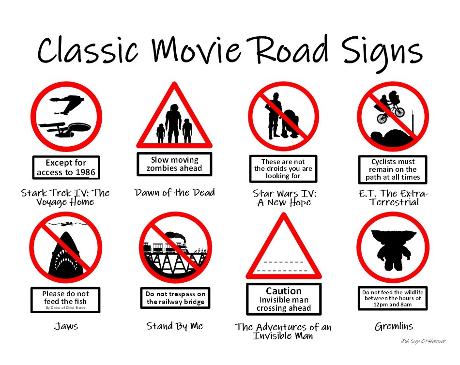 This print consists of eight custom-made street signs created by the Glasgow-based artist A Sign of Humour. They are all based on classic movies from the 1970s, 1980s and 1990s and were originally sited at various locations around Glasgow. The print itself is 7.25 inches by 9 inches (18.5 cm by 23cm), and it comes mounted in white 1.5 inch (3.5 cm) mount with a total size of 10 inches by 12 inches (25.5 cm by 30.5cm). This print is signed by A Sign of Humour.