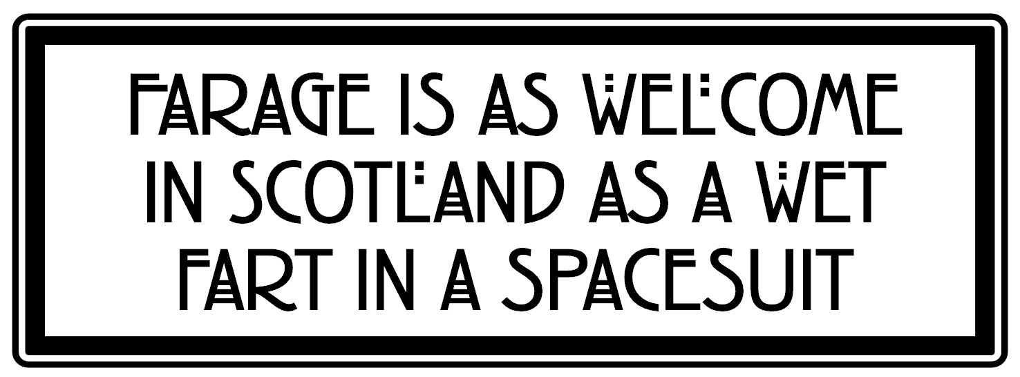 This is a vinyl sticker featuring the slogan Farage Is As Welcome In Scotland As A Wet Fart In A Spacesuit created by the guerrilla artist A Sign of Humour. It is 20cm by 7.2cm and is printed on hard-wearing vinyl with a gloss finish and a hi-tack adhesive back to ensure it will stay were it is put (so be careful where you put it).