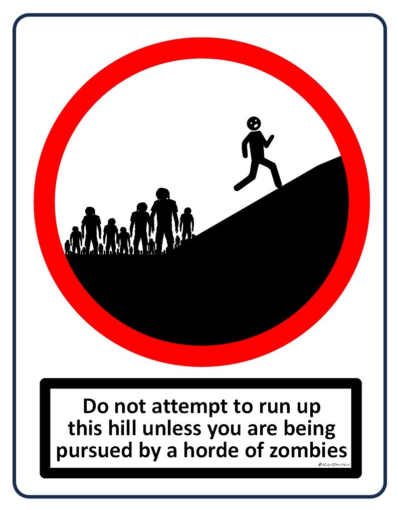 This sign is the Gardner Street Zombies sign created by the Glasgow-based artist A Sign of Humour. Gardner Street is one of the steepest streets in Glasgow, with many people struggling to walk, let alone run, up it. Yet a few hardy folk still attempt to do this, usually only once. This sign was originally placed at the bottom of this hill as a warning to anyone who was foolhardy enough to think about trying it for themselves. It is approximately the size of an A4 sheet of paper (210mm wide and 297mm tall) and is made of 1.5mm thick PVC.