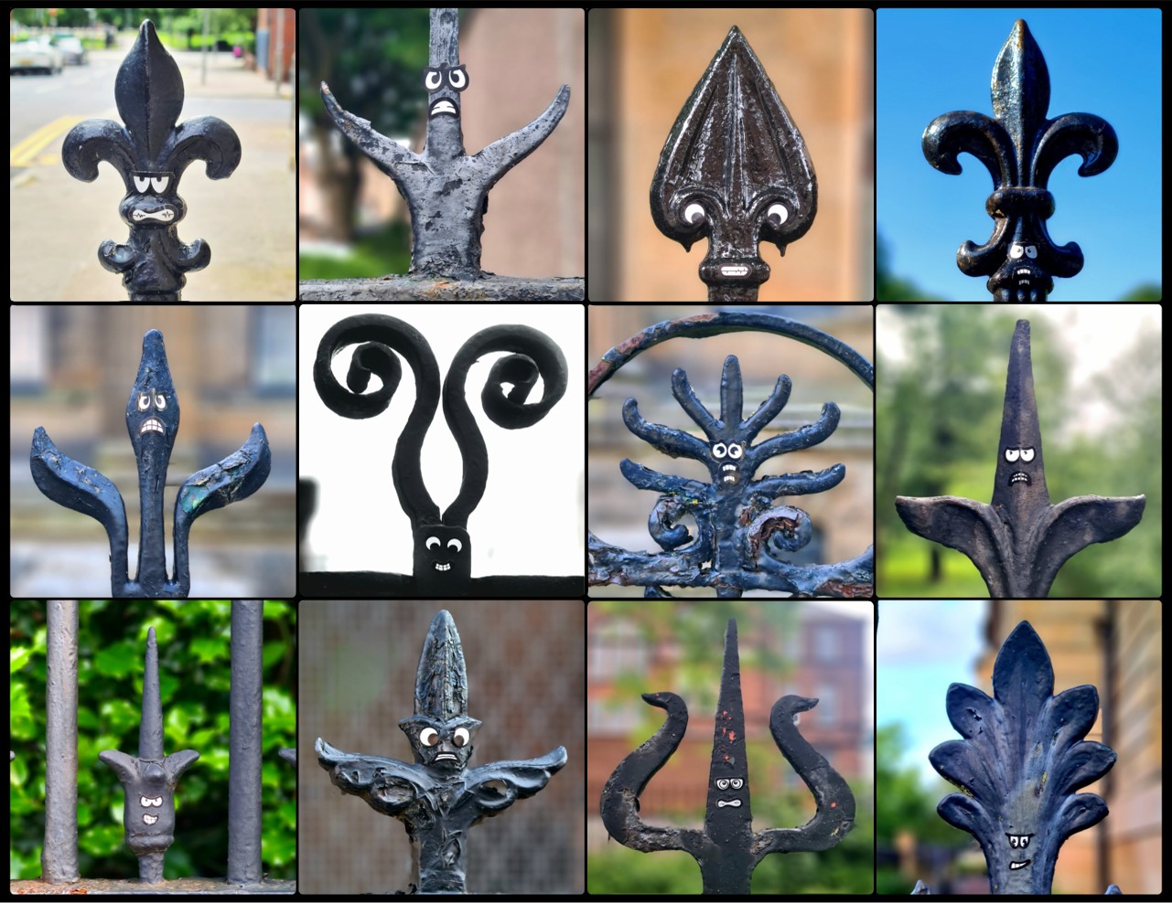 Railiens is concept created by the Glasgow-based street art A Sign of Humour. It involves using temporary vinyl stickers to transform Victorian decorative iron railings into alien creatures. The many different shapes of these railing lend themselves remarkably well to being changed into aliens, and with its unparallelled surviving Victorian architecture, Glasgow has an almost unending opportunity to create such alien creatures on the city’s streets. This print consists of twelve of A Sign of Humour’s favourite examples. The print itself is 7.25 inches by 9 inches (18.5 cm by 23cm), and it comes mounted in white 1.5 inch (3.5 cm) mount with a total size of 10 inches by 12 inches (25.5 cm by 30.5cm). It is signed by A Sign of Humour.