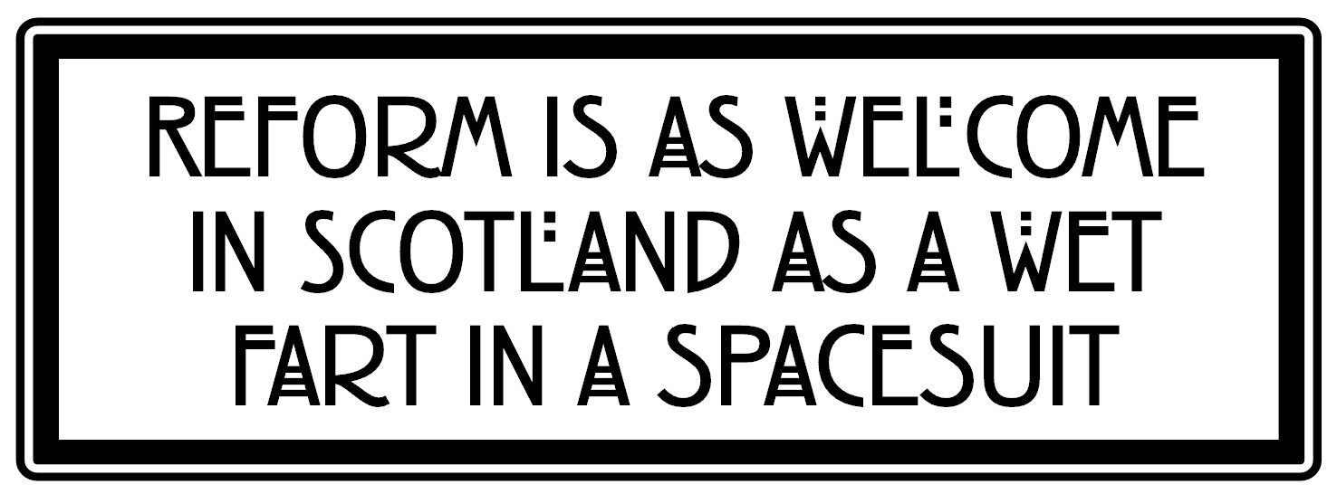 This is a vinyl sticker featuring the slogan Reform Is As Welcome In Scotland As A Wet Fart In A Spacesuit created by the guerrilla artist A Sign of Humour. It is 20cm by 7.2cm and is printed on hard-wearing vinyl with a gloss finish and a hi-tack adhesive back to ensure it will stay were it is put (so be careful where you put it).